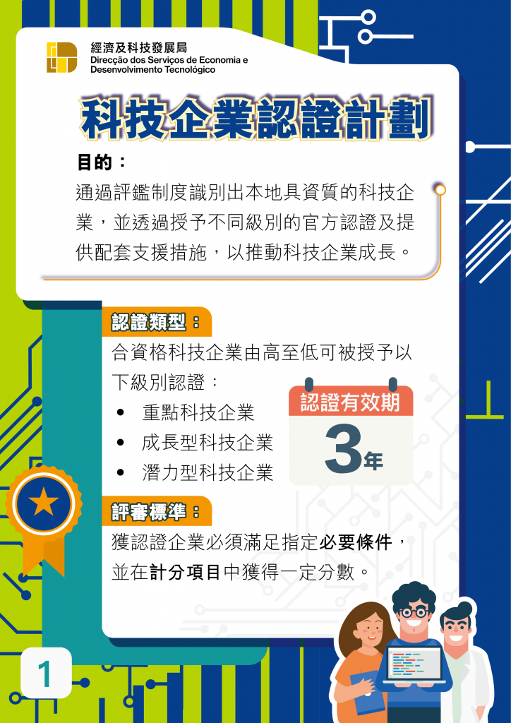 “科技企業認證計劃”旨在通過評鑑制度識別出本地具資質的科技企業,並透過為其提供不同級別的官方認證,推動相關企業擴展業務,同時配合特區政府提供的各類型支持措施,為本澳科技企業構築成長階梯,助力企業發展,完善本澳科創生態基礎。 本計劃將對申請企業的業務內容及規模、研發情況、創新程度等多維度進行評審,按評審及計分結果,由低至高依次對合資格企業授予“潛力型科技企業”、“成長型科技企業"或“重點科技企業”的認證資格,認證有效期為3年。