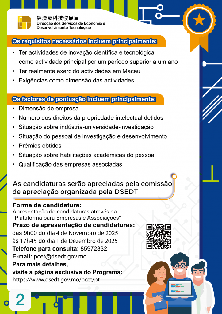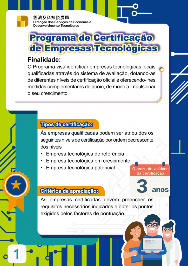 O Programa de Certificação de Empresas Tecnológicas (Programa) visa identificar empresas tecnológicas locais qualificadas através do sistema de avaliação, dotando-as de diferentes níveis de certificação oficial de modo a impulsioná-las a expandirem as suas actividades e, ao mesmo tempo, em articulação com as diversas medidas de apoio lançadas pelo governo da RAEM, construir uma escada de crescimento para empresas tecnológicas locais, ajudando as mesmas a desenvolverem-se, melhorando a base ecológica da inovação científica e tecnológica de Macau.